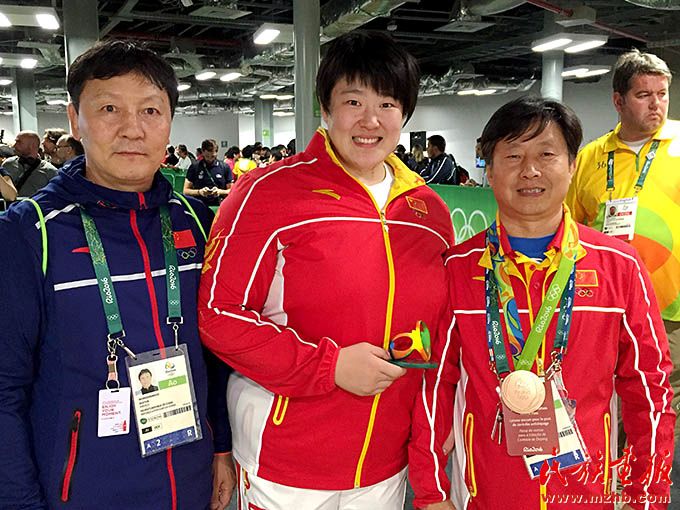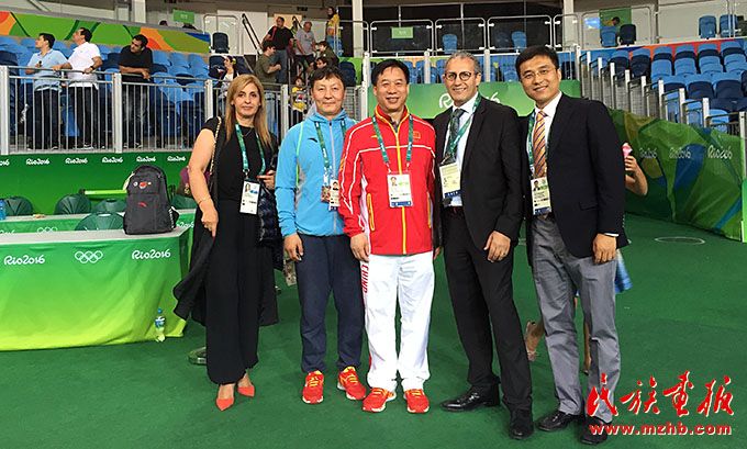 2016年,里約奧運(yùn)會(huì)期間,烏日根桑格(左)與中國(guó)國(guó)家柔道隊(duì)隊(duì)員于頌(中)、國(guó)家柔道隊(duì)原主教練程志山合影留念。