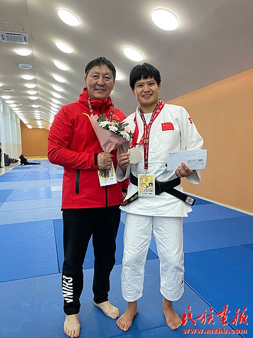 烏日根桑格(左)隨國(guó)家柔道隊(duì)參加 2021年世界柔道大滿貫比賽。圖為與國(guó)際級(jí)運(yùn)動(dòng)健將、國(guó)家柔道隊(duì)隊(duì)員楊俊霞合影留念。