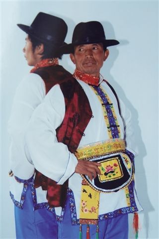 土族的服飾具有獨(dú)特的民族風(fēng)格,青壯年男子,戴有綿鑲邊的氈帽,也有的戴“鷹嘴啄食”的氈帽,身穿小領(lǐng),斜襟、袖口鑲有黑邊胸前鑲一塊四寸方塊的彩色圖案的長袍,還穿繡花高領(lǐng)的白色短褂,外套黑色或紫紅色的坎肩,腰系繡花長帶,穿大襠褲,系兩頭繡花的長褲帶和花圍肚,小腿扎“黑虎下山”(上黑下白)的綁腿帶,穿花云子鞋。老年人一般頭戴黑色的卷邊氈帽,穿小領(lǐng)、斜襟長袍,外套黑色坎肩,系黑色腰帶,腳穿白襪黑鞋。
