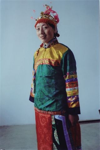 女子結(jié)婚或在節(jié)日期間的穿戴更為別致,身穿以綢緞縫制的兩袖口寬的繡花褂子,袖口鑲有七道或九道花邊,花邊上繡有各種花卉圖案,做工精細(xì),鮮亮多彩。頭戴鳳冠,土族語叫“首帕冠”,鑲著瑪瑙和珊瑚,前沿密墜細(xì)小的珍珠穗子,中間是細(xì)銀絲制成的鳳凰。戴鳳冠時(shí)還需要綴假發(fā)誓,并用長簪加固。佩戴這種頭飾,土族語叫“素不都腦達(dá)”(即索卡斗?扭達(dá)爾之音轉(zhuǎn))。