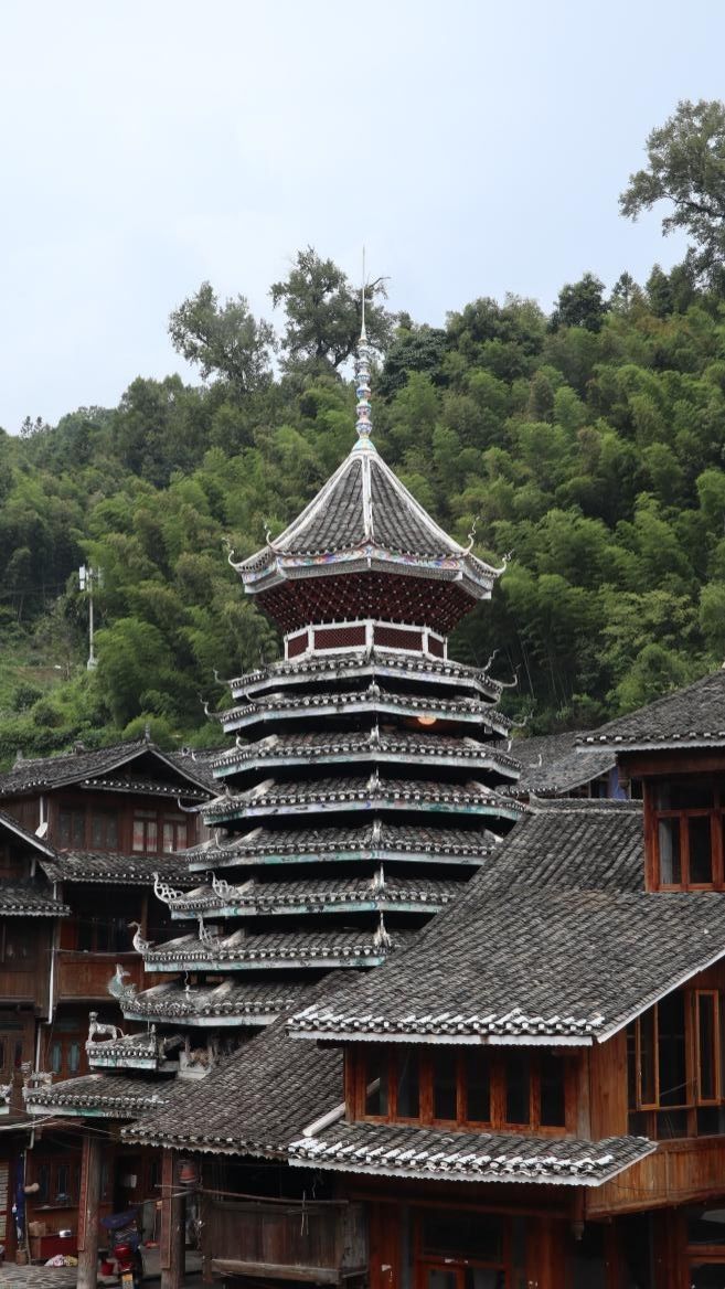 侗族認(rèn)為單數(shù)代表吉祥、好運,鼓樓層數(shù)均為單數(shù)。鼓樓以杉木為柱枋,鑿榫銜接,再加假柱,層層支撐而上,不用一釘一鉚。鼓樓是侗族議事、祭祀、娛樂休閑的場所。