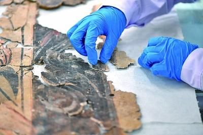 在山西大同云岡石窟研究院壁畫文物修復室,工作人員在進行壁畫修復。新華社發(fā)
