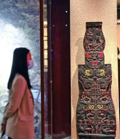 在位于北京的恭王府博物館內,觀眾在參觀展出的九連墩浮雕十弦琴。新華社發(fā)