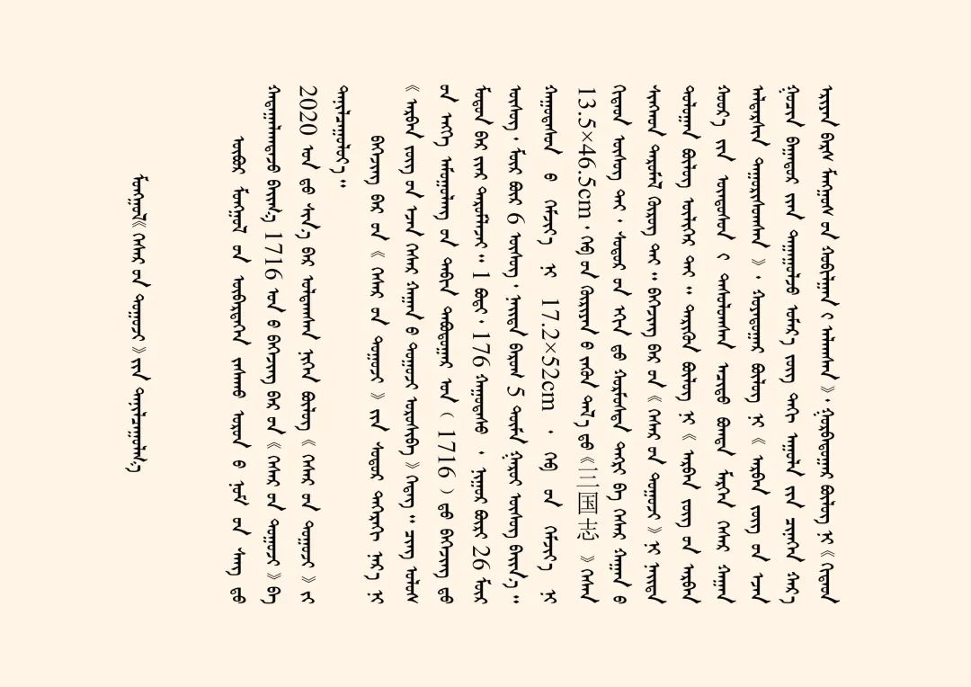 今天我們主要講述的是1716年北京木刻本蒙古文《格斯?fàn)杺鳌罚ㄈQ為《十方圣主格斯?fàn)柨珊箓鳌罚┦乔蹇滴跷迨迥辏?716)北京木刻本。梵夾裝,1卷(176葉),每頁(yè)26行,每行6個(gè)字,約5萬(wàn)多字,頁(yè)面高17.2cm、寬52cm,版框高13.5cm、寬46.5cm。版框左側(cè)有漢文《三國(guó)志》三字,首頁(yè)刻有朱印佛像。