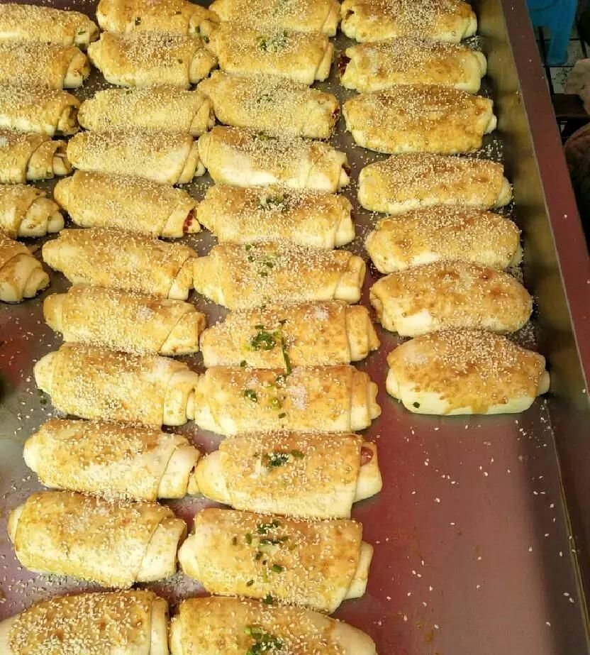外表黃澄澄,撒著一層芝麻,一口咬開,里面的辣椒、香腸、肉末是否讓您食指大動呢?