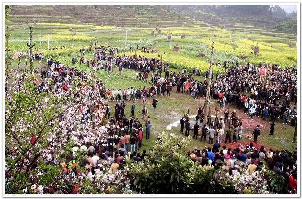 節(jié)日當(dāng)天,一大清早,人們穿上節(jié)日的盛裝,翻山越嶺地從各條大路小路往坡會(huì)地匯集。山坡上、田垌里、公路邊到處擠滿了看熱鬧的人群。