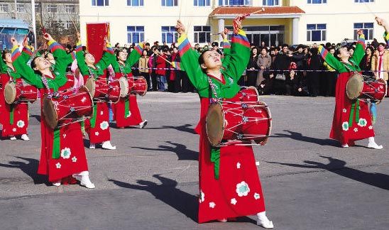 長鼓舞是朝鮮族代表性的舞蹈之一,脫胎于傳統(tǒng)的“農(nóng)樂舞”。長鼓分為長鼓、舞蹈長鼓、兒童長鼓和幼兒長鼓等幾種。形狀是兩頭粗、中間細,左邊鼓筒直徑比右邊鼓筒直徑大1厘米,右邊鼓皮薄,左邊鼓皮厚。