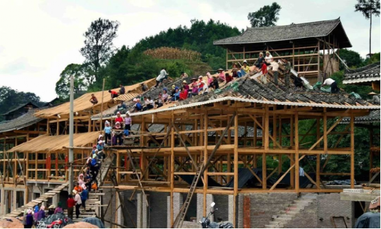 苗寨吊腳樓的修建程序有很多步,有選擇屋基→備料→發(fā)墨→拆枋鑿眼→穿排→立房→蓋瓦→裝扮等多道工藝流程。