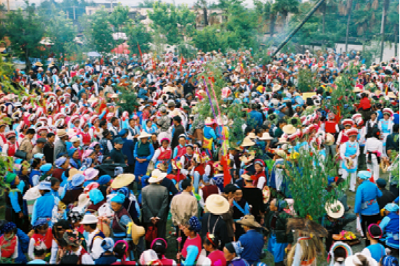 “繞三靈”活動的特點,除了向本主神靈祈求風(fēng)調(diào)雨順的內(nèi)容之外,主要在于其歌舞活動所表現(xiàn)的男女情愛無所顧忌,放達(dá)不拘。每個歌舞隊列領(lǐng)頭者均為男女巫二人,他們以一手共執(zhí)一株齊人高的樹枝,另一手分別揮舞牦牛尾和花手巾,邊舞邊唱,引領(lǐng)著隊伍緩緩前行。樹枝上掛著紅綢系著的葫蘆,據(jù)說葫蘆象征母腹,紅綢象征陰血。他們口唱的調(diào)子稱“活恩枯”直譯為“花柳曲”,一唱一和,幽默風(fēng)趣。其后的歌舞隊列,唱的也都是充滿艷情的調(diào)子,跳的是霸王鞭和八角鼓舞,舞姿多有男女背靠背、心合心、腳勾腳等形式,無拘無束地表達(dá)著熾熱的情感。