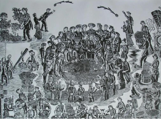 云南馬關(guān)壯族農(nóng)民版畫起源于馬關(guān)縣仁和鎮(zhèn)阿峨新寨村,“以刀代筆”是其主要的藝術(shù)形式,刀法粗獷、豪放而不乏細膩,具有濃郁的鄉(xiāng)土氣息和深厚的民族文化內(nèi)涵。