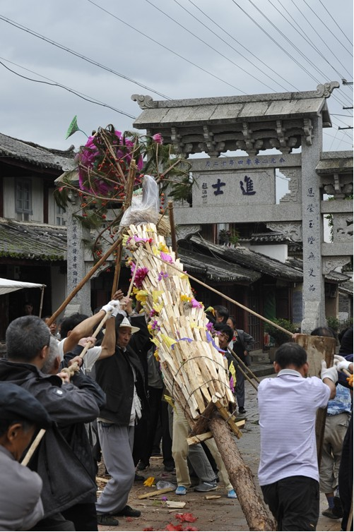 在劍川,都是由家里喜添子嗣的人家來籌備火把節(jié)的一切事宜,除了對新生兒的祝福,火把樹的裝扮也表示劍川人祈愿風(fēng)調(diào)雨順,人壽年豐、鄰里和諧?;鸢岩樱ㄩc年要扎十三層),上面六層的明子和柴分別由細到粗,一層接著一層,下面七層都是一樣的新柴。喻示每一個新的日子都紅紅火火。