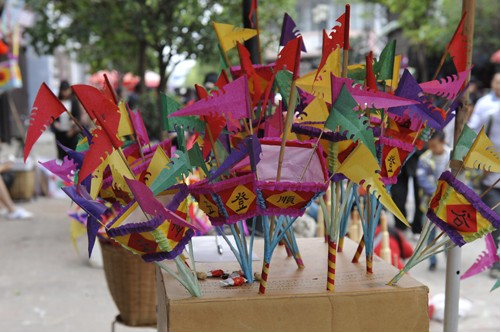 早上十點左右,火把就快扎好了。色彩鮮艷的紙裱斗升上各色卷著的彩旗正一個個被打開,梨、蘋果、花紅正被栓成一串串地掛在樹枝上,水泥桌上擺著小旗、炒蠶豆和糖果等,老人們在一旁邊笑邊聊,一盤彩色米干在燦爛的笑著。