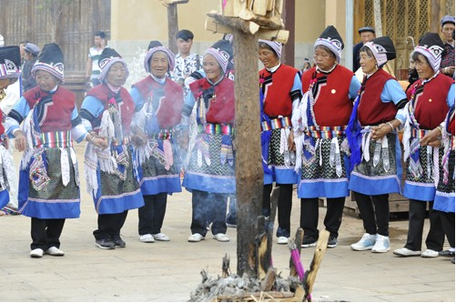 到了這一天,親友鄰居都不請自到來幫忙和祝賀。綁扎柴禾,做小彩旗,栓水果串等,等一切都好,再齊心合力豎起火把。等掛著果串的斗升一點點離開地面,火把樹穩(wěn)穩(wěn)當(dāng)當(dāng)挺立的時候,孩子的奶奶和外婆就在火把樹下燃起香,敬上茶酒和米干,虔誠地磕頭祈禱。