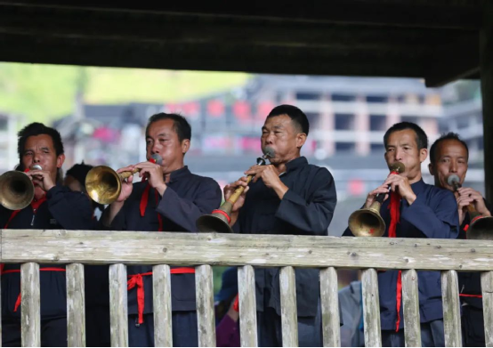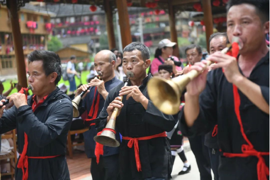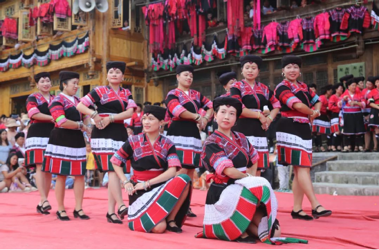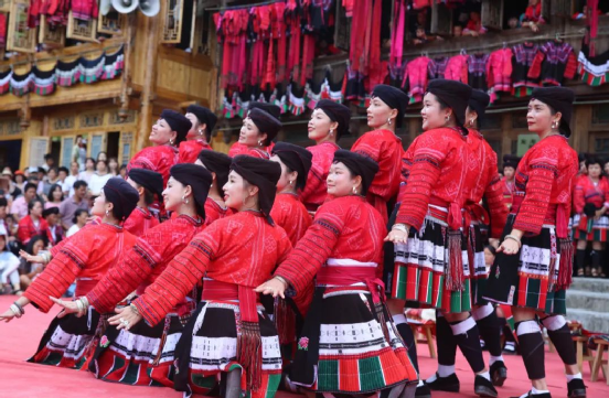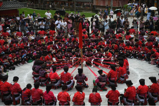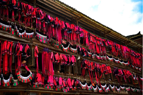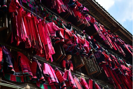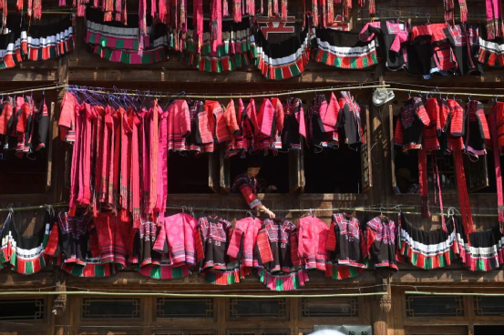 這一天,寨子里賓客盈門熱鬧異常,嫁出去的女兒和在外寨入贅的兒子都要挑著鴨子、酒和禮品,背著小孩回家吃團(tuán)圓飯,家家戶戶包粽子過(guò)大節(jié)。紅瑤姑娘和嫂子們,紛紛推開(kāi)窗戶,拿出民族盛裝一件件掛在窗外晾曬,整個(gè)寨子掛滿了紅衣服,顯得格外鮮艷奪目。