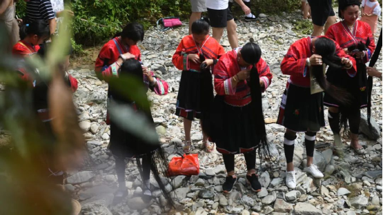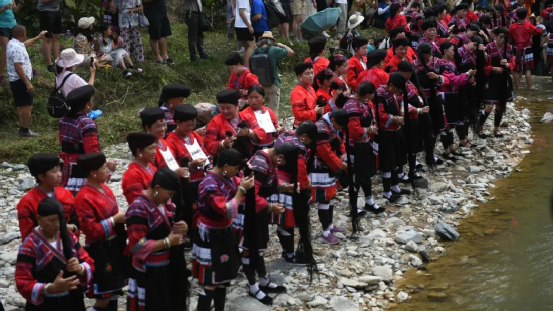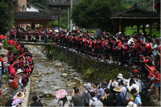 曬衣節(jié)當(dāng)天還進(jìn)行了嗩吶鑼鼓迎賓、瑤嫂長(zhǎng)發(fā)梳妝展示、“抬金狗”送祝福、紅瑤服飾加工展示、紅瑤集體婚禮等活動(dòng),豐富多彩的民俗文化、濃郁的民族風(fēng)情,讓各地游客流連忘返。