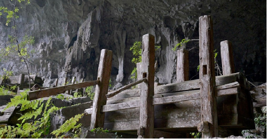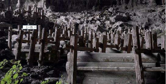 果里巖洞葬位于貴州龍里縣擺省鄉(xiāng)果里村東1公里煤洞坡的洞穴中,地處巖溶山原,峰叢林立,喬灌間雜。該洞在山頂下四十米處呈南北向橫穿山體,長(zhǎng)580米,寬為38—65米,高為21—50米,有兩個(gè)入口;北面入口,寬54米,高21米,;南面入口,寬35米,高45米,有三道石砌墻垣。洞中地勢(shì)內(nèi)斜平緩,洞內(nèi)干燥,能見(jiàn)度好,入口處地勢(shì)外斜。據(jù)查,果里的苗族于明朝初期從貴陽(yáng)遷徙而來(lái)。從遷徙之初至清末,他們均習(xí)慣將亡者殮于棺木集中存放在洞穴之內(nèi)。在洞穴北面入口3000平方米的范圍內(nèi)現(xiàn)存完好的棺木有192具,腐朽散落及其它原因損毀的約200余具。棺木材質(zhì)為杉木。棺木有平板平頭和鼓型雄頭之分,其大小因亡者的體型而定。平板平頭型棺木制作粗糙,長(zhǎng)1.45—2.23米,寬0.46—0.75米,高0.46——0.9米;鼓型雄頭棺木多為杉木本色,長(zhǎng)1.5—2.23米,寬0.48—0.8米,高0.5—0.9米。棺木一律頭向北面入口,均固定于兩個(gè)或三個(gè)“井”字架上;三個(gè)“井”字架表明亡者為男性,兩個(gè)“井”字架的為女性。棺內(nèi)亡者頭靠凹型木枕。平板平頭棺為明代,鼓型雄頭棺為清代。