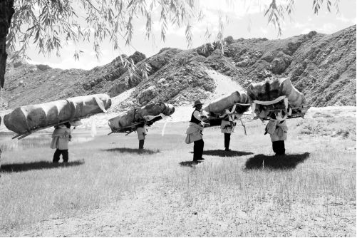 據(jù)悉,每次表演舞蹈時,“阿熱”只能唱二、三首歌,唱久了因船夫們負重太多堅持不了很長時間。俊巴“郭孜”的響聲很特別:船夫們舉雙手把船扶住,一支船槳從船夫的腰背上穿過,與背上的木質(zhì)滑輪撞擊后發(fā)出響聲。這響聲在一般跳“果諧”舞中感受不到,它有一種人與自然頑強抗爭的個性特點。阿熱”的基本舞步均取之于當?shù)亍肮C”,具有靈活多變,頓地為節(jié)的特點,而船夫們的“顫膝擺”等姿態(tài),更具有“高原之舟”—— —牦牛的特性。整個舞蹈既輕盈又凝重,別有一番情趣。