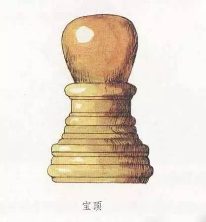 在建筑物的頂部中心位置,尤其是攢尖式屋頂?shù)捻敿馓?,往往立有一個(gè)圓形或近似圓形之類(lèi)的裝飾,它被稱(chēng)為寶頂。在一些等級(jí)較高的建筑中,或者確切地說(shuō),在皇家建筑中,寶頂大多為銅質(zhì)鎏金材料制成,光彩奪目。