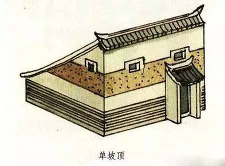 單坡頂就是只有一面坡的屋頂。它與我們常見(jiàn)的兩面坡屋頂有較大的不同,但從一面來(lái)看又有極大的相似性。我們甚至可以說(shuō),單坡屋頂就像是兩面坡屋頂被從中間一切兩半了。單片屋頂一般都用在不太重要的建筑或是附屬性的建筑上。在已發(fā)掘的商代宮殿遺址中,可以看到在商代即有單坡頂?shù)睦茸恿?。而現(xiàn)在的陜西、陜西等地的農(nóng)村,許多民居仍然使用單坡式的屋頂,成為現(xiàn)今較富有特色的一種民居形式。
