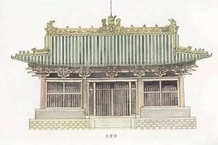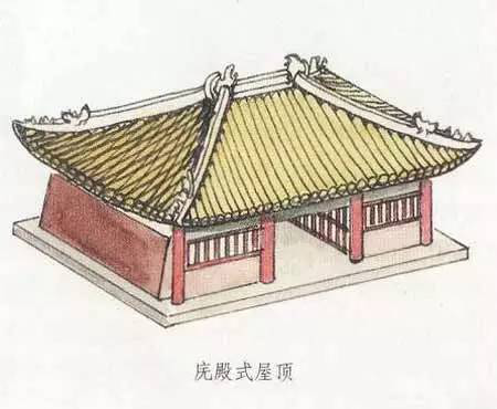 根據(jù)資料與記載,廡殿頂屋頂早在殷商時(shí)代就已出現(xiàn)。不過(guò),現(xiàn)在對(duì)唐代中期以前的廡殿式屋頂?shù)木唧w結(jié)構(gòu)已無(wú)從得知,晚唐以后漸有實(shí)例可查。其形象是屋面平緩,正脊較短。正脊兩端為鴟尾而不是鴟首。