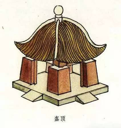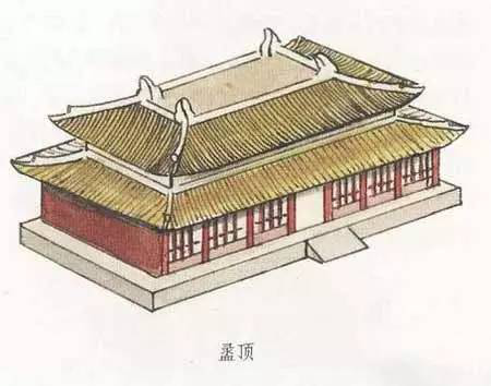 盝頂,是一種較為特別的屋頂形式。這種屋頂形式是在屋頂上有四條與屋檐平行的屋脊,四條屋脊構(gòu)成一個(gè)長(zhǎng)方形或正方形的平頂,其四角各有一條垂脊向下斜伸,共形成四塊坡檐。盝頂這種頂式在古代大型宮殿建筑中極為少見(jiàn)。