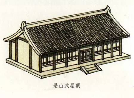 懸山式屋頂與硬山式屋頂一樣有一條正脊和四條垂脊。不過(guò),它又有不同于硬山式屋頂那樣與山墻平齊,而是伸出山墻之外。這部分伸出山墻之外的屋頂是由下面伸出的桁(檁)承托的。所以懸山式屋頂不僅有前后出檐,在兩側(cè)山墻上也有出檐。懸山式是兩面坡屋頂?shù)脑缙谧龇?,不過(guò)中國(guó)古代的重要建筑基本沒(méi)有使用懸山式屋頂?shù)?,特別是唐代以前尤為少見(jiàn)。