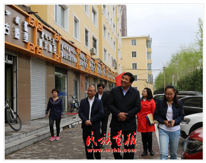 2017年5月3至4日,內(nèi)蒙古自治區(qū)民委副主任薩楚日勒?qǐng)D(前左二)、語文處處長曹雙喜(前左一)檢查呼和浩特市的蒙漢雙語牌匾情況(民族畫報(bào)資料)