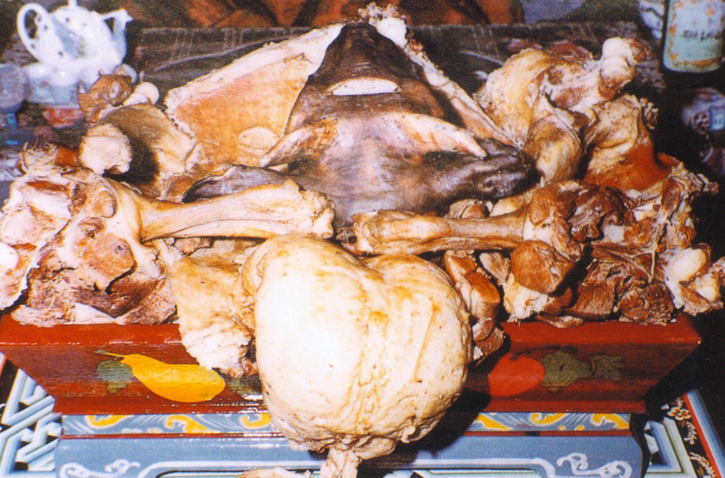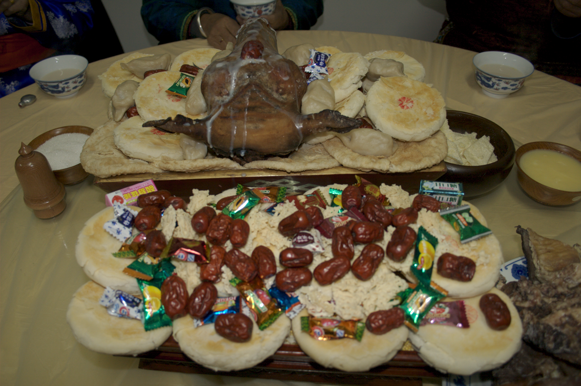 全羊席,又稱整羊席(蒙古語為“布禾勒”或“酥斯”),是蒙古人招待貴賓的傳統(tǒng)佳肴,也是蒙古民族最古老、最隆重的一道宴席,一般只在盛大宴會、隆重集會、舉行婚禮或接待高級貴賓時(shí)擺設(shè)。將整羊加工后擺在長方形的大木盤里,像一只臥著的羊,肉味鮮美,香飄滿堂。賓客在進(jìn)餐前,還要舉行一定的儀式,高唱贊歌,朗誦獻(xiàn)整羊祝詞等。據(jù)文獻(xiàn)記載,成吉思汗曾設(shè)過全羊宴。忽必烈登基時(shí),也設(shè)全羊宴祭神祇、待賓客。至清代全羊宴更加盛行,現(xiàn)已成為蒙古民族風(fēng)格接待貴賓的名貴菜肴,馳名中外。