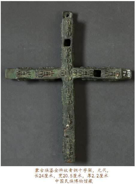 眼前此件在內(nèi)蒙古達茂旗出土的元代鎏金青銅十字架,四面排列有浮雕金剛杵紋,其正面每個金剛杵圖案上均有鎏金裝飾,十字架上部穿孔則可用于懸掛。金剛杵是藏傳佛教里的修行法器,象征力量與智慧;而十字架則是基督教文化的標志,如此混搭,歷史便要傳遞出種種:在信仰藏傳佛教的蒙古高原,金剛杵,象征無畏圓滿,十字架,則代表救贖重生,東西方文化的結合亦呈現(xiàn)某種文明可能達到的無可比擬之高度。
