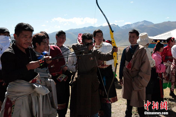 圖為青海省玉樹藏族自州當?shù)孛癖娺M行射箭比賽來慶?!般逶」?jié)”到來。來源:中新社 攝影:孫睿