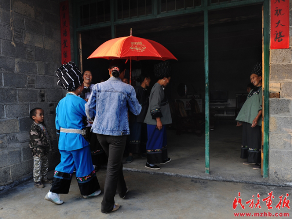 姑娘出嫁必須有娘家人陪送,婚禮這一天清早,“新娘”便在“接親客”的帶領和送親隊伍的陪同下,一路歡聲笑語 ,浩浩蕩蕩向“新郎”家走來。走到新郎家村邊,有的燃放鞭炮,一直燃放到新郎家門口,請新郎父母出來開門;無鞭炮準備的,則在寨邊稍候,由迎親伙伴飛報新郎家做好迎親的準備。男方父母聽到后,多數(shù)是很高興地喊醒家中兒女,由新郎的妹妹或堂姐妹為迎親主體,加上寨上的姐妹和房族組成迎親隊伍,打開大門,把新娘迎進家來。接親的主要儀式是接傘。接傘的人必須是新郎的小妹或堂妹。無親妹、堂妹者則由新郎父母指定一與新郎同輩份的小姑娘去接。新娘走至大門,即由新郎的妹妹跨出門外迎接新嫂子,新嫂子接著用左手把雨傘遞給接傘的妹妹,接傘妹妹接過新嫂子手中的雨傘后,新娘即用左腳跨進屋內,以示今后成為新家庭的主婦。隨即由接傘妹妹攜新娘手迎入新房,迎親婦女們陸續(xù)進入新房休息。入門后,新郎家的“陪娘”及姑娘們便熱情地安排“送親客”團團圍坐,并簇擁著“新娘”緊靠堂屋中柱子就坐,意為“新娘”從此當家立業(yè),將來就像中柱子一樣,頂大梁,撐起這個家。