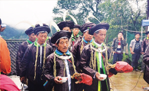 據(jù)介紹,舉辦牯藏節(jié)是為了給苗族人家?guī)硇腋?。牯藏?jié)第一天,牯藏頭(由村里5位精干的已婚男子組成)在村中挑選連同自己在內(nèi)的12名德高望重的長老,組成一支祭祀隊(duì)伍,安排祭祖。他們用新砍伐的木竹編織成坐榻,讓6個(gè)年輕人坐于其上,30余人抬著他們,前面長老開道,吹起祭祖蘆笙,跳起祭祖舞,抬著祭祖飯,向祭祖堂緩緩走去,進(jìn)行殺牛豬、祭奠等。