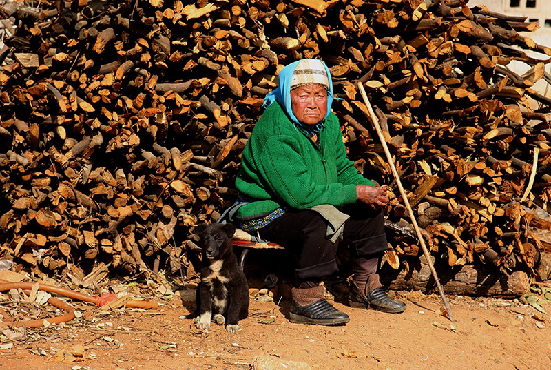 2月初的丘北,連日陰雨,是一年中最冷的時節(jié)。我先于拍攝團隊幾天到了村里,想獨自在這里轉(zhuǎn)轉(zhuǎn),熟悉一下村民,篩選一下拍攝的人物。正當(dāng)我在一個泥濘的岔路口徘徊,尋思著是否要問路去村主任家的時候,旁邊屋子里走出一個人,面容親善:“天好冷啊,進來烤烤火吧!”他打招呼的方式如同熟人,一笑時露出兩排又白又整齊的牙齒。于是,他家擁擠的火塘邊又多了一個人。大家圍著火爐有一搭沒一搭地聊天,語調(diào)溫和小聲,沒話的時候大家也不覺得別扭,只聽見玉米骨在火塘里噼啪作響。這是一個五代同堂的大家庭,招呼我的主人楊樹紅和妻子以及祖母、父母一起生活,兒子和女兒在廣東打工,已經(jīng)回村準(zhǔn)備過節(jié),兒子未婚,女兒則有了兩歲的孩子。楊樹紅的祖母出生于1922年,是這個村子里最老的老人,耳朵有些背。我大聲問她是否還記得年輕時候踩花山,她拍著我的手背說:“17歲我就去踩花山嘎!好玩嘎!”兒媳笑著解釋說:“估計她說的是17歲踩花山的時候碰到爺爺,被他拖媳婦拖走的事呢?!弊婺改昙o(jì)太大,看著她手上和臉上深深的褶皺,不知藏了多少往事。