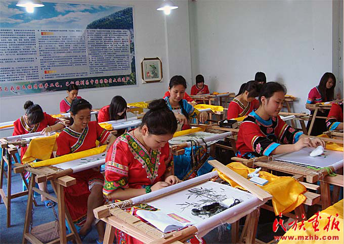 2015年,李紹玉榮獲年度“全國(guó)優(yōu)秀農(nóng)民工”。2016年,李紹玉成為重慶非物質(zhì)文化遺產(chǎn)——彭水苗繡的代表性傳承人。從一個(gè)打工女,到回家鄉(xiāng)帶動(dòng)村民致富,再到成為全國(guó)人大代表,她說(shuō)自己深感榮幸和責(zé)任重大?!翱偫韴?bào)告里專(zhuān)門(mén)提到‘加強(qiáng)文物保護(hù)利用和文化遺產(chǎn)保護(hù)傳承’,我自己的成長(zhǎng),就得益于此。苗繡是苗族人民古老而美麗的技藝,我們有責(zé)任把它世代傳承下去。我們也要在苗族文化與手工藝術(shù)品融合上下功夫,使傳統(tǒng)工藝與市場(chǎng)結(jié)合、傳統(tǒng)元素與現(xiàn)代時(shí)尚相結(jié)合?!?/p>