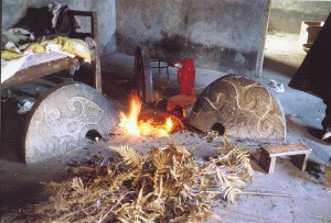 涼山彝族獨特的“鍋莊石” 。彝族的火塘為全家的生活中心,進食、取暖、照明、會客、議事等都圍著火塘進行。“鍋莊”由3塊石頭支撐,一般在房屋建成前就請石匠打造好鍋莊石。其石料選取沒有污垢而又無缺陷的青石,鑿成厚10厘米左右的變異扇形,上面刻有龍、火、日、月、魚、鳳等古樸傳神的浮雕圖案。日常生活中,一般在鍋莊“上方”(火塘里側至墻壁)設矮床。