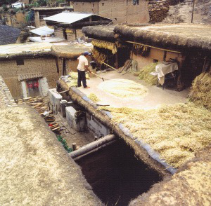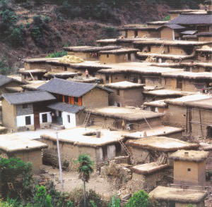 土掌房屋頂 云南楚雄地區(qū)的土掌房,是土墻、土頂、外墻和底層無窗的兩層樓房。有的內(nèi)院也蓋屋頂,稱“無內(nèi)院式”。設天窗采光,屋頂還能當曬臺。整個村落沿山坡而建,巷道很窄,遠遠望去,你家的屋頂是他家的院壩,只要上了一家屋頂,就能靠活動的木梯自由往來。