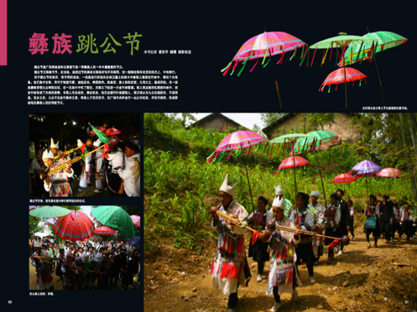 跳公節(jié)的活動以祭神和歌舞為主,內(nèi)容豐富多彩,整個節(jié)日要進(jìn)行三天才能結(jié)束。過節(jié)時全村男女老少都要穿上節(jié)日盛裝,由畢摩(即巫師,彝語中有教師的含義)宣講祖先的功績,帶領(lǐng)大家祭拜,隨后是飲酒唱歌,眾人打著銅鼓,吹著葫蘆絲,圍繞金竹叢,遵循傳統(tǒng)的舞蹈步伐,由慢而快,由低潮到高潮,盡情歡慶。青年們則表演象征圍獵、殺敵的“跳閘門”、“跨斷橋”等舞蹈,表示緬懷先祖的英勇尚武精神。四周擺滿節(jié)日食品,大家可邊吃邊舞, 還不時地穿插著畢摩的念經(jīng)、祈禱、祝福等儀式,期間還要舉行賽馬和各種表演活動。天黑以后,青年男女則成群結(jié)隊(duì)到各家各戶輪流跳舞、祝福,甚至徹夜狂歡。第三天是做“三朝”,主題是祭山。村民們穿著新衣,敲著銅鼓,吹著葫蘆絲,打著花傘,在山間小路上魚貫而行。來到山坡之后,依舊是唱歌跳舞,念經(jīng)祈福,男青年則表演各種節(jié)目。祭山結(jié)束后,來參加節(jié)日活動的客人要立即離去,否則便被視為不友好。等客人走完,全村男女凡是能干活的都得于當(dāng)天下地做一門活路,表示人勤神佑,今年定將獲得好收成。