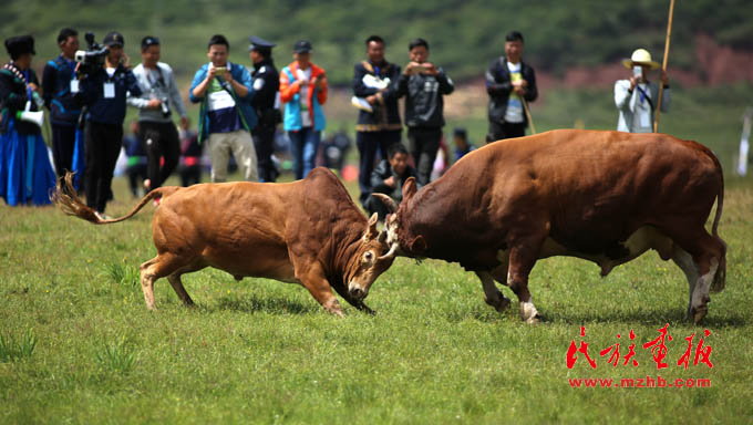 在力量與勇氣展示項目中,最激烈的賽事當(dāng)數(shù)斗牛、斗羊,兩頭斗志昂揚的公牛在草地上激烈地用牛角頂著對方,發(fā)出響亮的牛角撞擊聲。斗羊場的激烈在于,兩只公羊在相互頂撞前,往往后退十幾米,方便加速,增加頂撞時的力量,羊角碰撞的聲音清脆響亮,久久回蕩在賽場上空。圍觀的人們里三層外三層地圍著,緊緊跟著對壘中的牛羊一起移動,跑著跳著在一旁高聲吶喊。