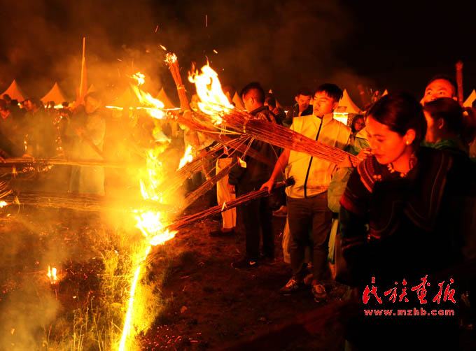在昭覺縣谷克德涼山彝族傳統(tǒng)火把節(jié)上點燃火把的人們