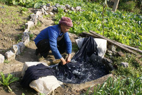 從前壯族鄉(xiāng)村,普遍掌握制作藍(lán)靛及印染方法。一般置一大缸,將藍(lán)草放入浸泡,加石灰使之分解、發(fā)酵,經(jīng)過(guò)化學(xué)變化,而后濾去殘?jiān)?,蒸發(fā)水分,凝成糊狀藍(lán)色染料。其間需不斷攪動(dòng),使色素充分化解?!懊康宀萘俳?,造成一百斤之靛為佳。”因產(chǎn)量較多,遠(yuǎn)銷(xiāo)廣東。浸染時(shí),將適量靛糊化于染缸中,同時(shí)將雞血藤搗碎加入。布要反復(fù)浸泡多次,晾泡結(jié)合,直到染為深藍(lán)色。其間雞血藤釋放出一種紫紅色的植物膠,將藍(lán)靛色素粘在纖維上,是色素耐水耐腐耐紫外線,不易褪色,并有若隱若現(xiàn)的亮點(diǎn),結(jié)實(shí)美觀。這個(gè)過(guò)程,運(yùn)用了化學(xué)分解法。