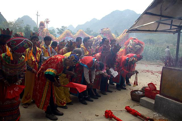 壯族霜降節(jié)頭降的早晨,先要在戲臺舉行隆重的酬謝活動。人們進行祭拜,從請神、求神到送神,將壯族美好和諧的祈愿寄托在美好的自然事物身上,以表達對自然之神的崇敬之情,表達祈盼五谷豐登的良好愿望。近年還增加了祈福長壽的內(nèi)容。