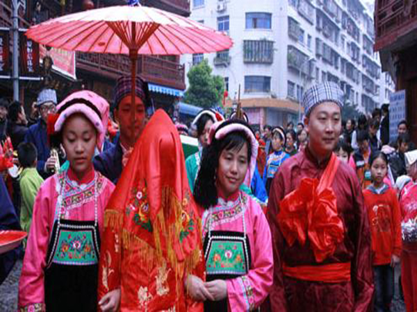 男方的“提親”得到應(yīng)允以后,雙方即開始頻繁往來,加深感情。到了可以談婚論嫁的年齡,便舉行“訂親”儀式。由男方選擇吉日,通知女方做好準(zhǔn)備。那一天,男方家請人抬著用大紅紙封口的一大壇酒、若干塊紅糖、一盤用紅紙包裝的爆竹、一只大公雞,另外還要送彩禮錢若干,其數(shù)量不同時代、不同地區(qū)有不同的慣例。訂婚儀式后,準(zhǔn)女婿每年給岳父家送一只豬腿、糯米粑及酒等禮物,以示孝敬。