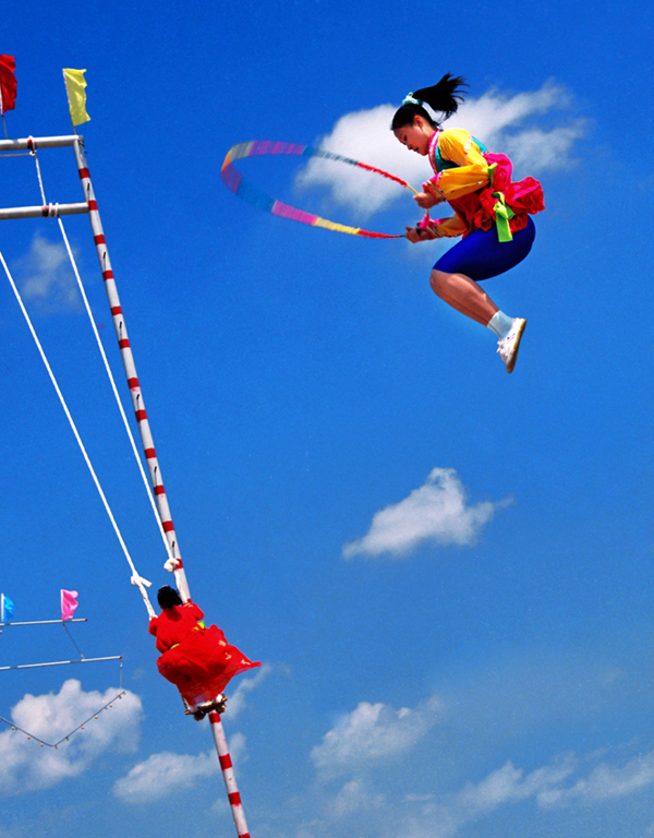 民間跳板長(zhǎng)5.5米、寬4.0厘米左右,厚5.0至6.0厘米。跳板中間的下面立板墊,高3.0厘米。比賽時(shí)有專人守護(hù)板墊,防止跳板掉下。站在跳板兩端的姑娘輪番連續(xù)起跳,逐漸將對(duì)方彈送得更高。在身體騰空時(shí)能表演出驚險(xiǎn)動(dòng)作者最受歡迎,如剪式跳、旋轉(zhuǎn)跳、空翻跳,甚至跳藤圈、做造型、舞花環(huán)、揮彩帶等。靈巧優(yōu)美、五彩紛呈,令人眼花繚亂,驚嘆贊賞。