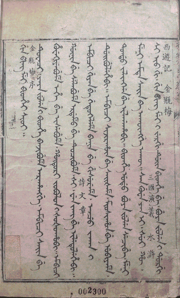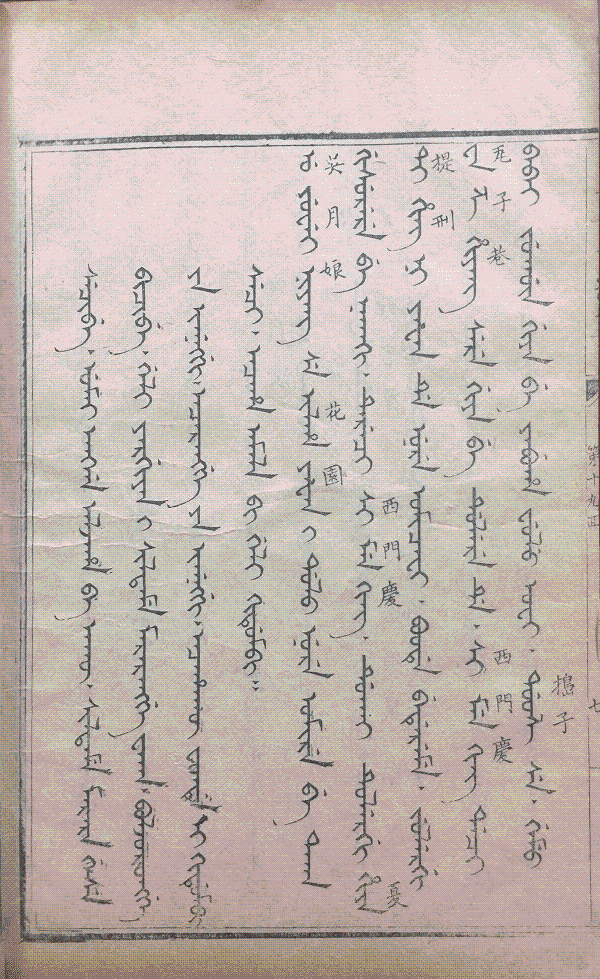 滿文本《金瓶梅》國(guó)內(nèi)藏有國(guó)家圖書館刊本、中央民族大學(xué)圖書館刊本、趙則誠(chéng)先生藏刊本(殘)、中國(guó)社科院民族研究所刊本(殘)、大連圖書館抄本、吉林大學(xué)圖書館精抄本、中國(guó)民族圖書館刻本等。此外北平闞君云敝處所藏有蒙文《金瓶梅》。