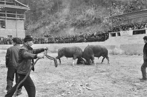 2014年1月2日,貴州省榕江縣仁里水族鄉(xiāng)仁吉侗寨群眾開展斗牛活動,歡慶一年一度的侗年。
