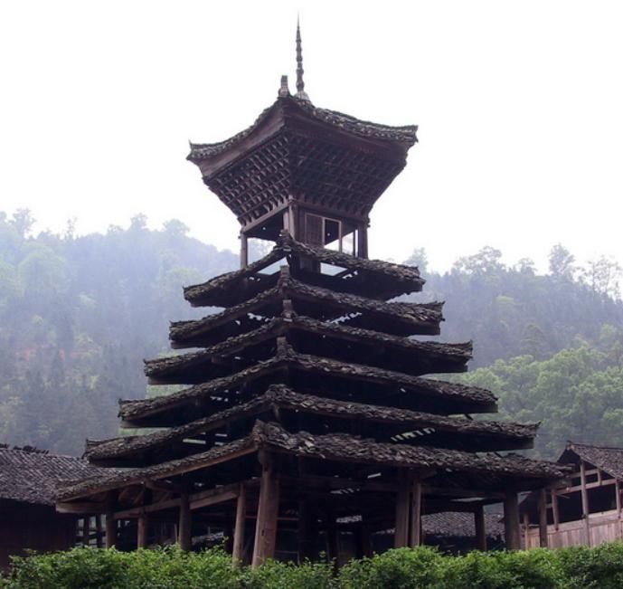 看這一座座高聳入云的鼓樓,氣勢十足,這是侗寨的標(biāo)志性建筑,爬上鼓樓最頂端,便可在侗寨中“一覽眾山小”。鼓樓的造型為杉樹,最初為“遮陰樹”。古時(shí)在樹蔭下聚會(huì)議事歌舞娛樂,但樹蔭不避風(fēng)寒。勤勞智慧的古人便仿杉樹形狀在寨中建起“堂瓦”,雨能避濕,冷能避寒。