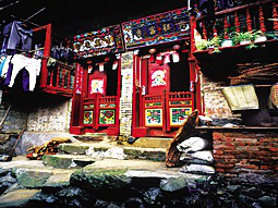 狹長式的房屋大都建在深山里幾十戶大小的村寨。面闊一間并開正門,室內(nèi)隔間向縱深排列,從正門到后門有7道門之多。正門是大門也是第一道門,是家族的門面,被視為招財進寶和迎接貴客之門。對開門扇高大厚實,門檻上又設兩扇雕刻彩繪的矮門,天熱開大門通風時,可以防止禽畜入戶。大門兩側(cè)掛有木刻大字對聯(lián),大門墻面的屋檐下則畫有七彩畫卷。