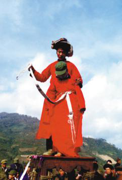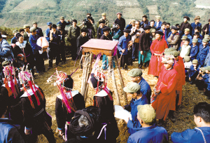 “跳五臺(tái)”可算是儀式中較為引人注目的。在村邊的一塊場(chǎng)地中央搭好一座約兩米高的木臺(tái),叫做“五臺(tái)”。受戒的弟子們同樣帶著草帽,身穿紅袍,由師父帶領(lǐng)走向五臺(tái)。在鑼鼓聲中,繞五臺(tái)三圈,繞畢盤(pán)腿坐好。師傅叫到誰(shuí),誰(shuí)就起來(lái),在師父的指引下,沿木梯爬上高臺(tái)。蹲在五臺(tái)上的受戒者,雙手十指交錯(cuò),小心翼翼地向后移動(dòng)到桌邊,然后翻落于藤網(wǎng)之中,由網(wǎng)中的棉被將受戒者包住。師父掀開(kāi)棉被,見(jiàn)受戒者十指仍然穩(wěn)扣,坐像端端正正,表示度戒成功。十幾位弟子輪番上臺(tái),每位都順利通過(guò)。受戒弟子的父母和鄉(xiāng)親們都為他們的成功而歡喜。