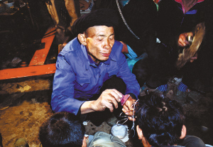 這天,我們剛好在縣里采訪,聽(tīng)說(shuō)高良鄉(xiāng)瑤族村寨要舉行度戒活動(dòng),于是就直奔瑤寨而去。一進(jìn)寨子,馬上感覺(jué)氣氛不同?,幾鍕D女們頭戴別致的大銀盤(pán),身著盛裝,真像過(guò)節(jié)一樣。經(jīng)了解后,得知寨子里共有十幾個(gè)男孩要參加這次度戒。寨子里的一位老人告訴我們,一般情況下,只是兩三人,這樣多的男孩一同舉行度戒儀式是很難碰到的。看來(lái),我們的運(yùn)氣還真不錯(cuò)。我們來(lái)到度戒地點(diǎn),見(jiàn)到將要度戒的十幾個(gè)男孩集中在一起,用棉被蒙著頭,不能見(jiàn)陽(yáng)光,要等儀式完后,才能見(jiàn)陽(yáng)光。
