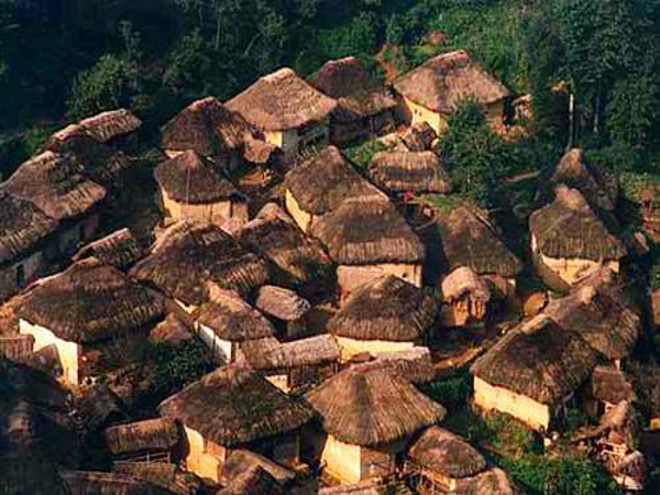 蘑菇房由土基墻、竹木架和茅草頂組成,屋頂為四個斜坡面。房子一般分三層:底層關(guān)牛馬堆放農(nóng)具等;中層用木板鋪設(shè),隔成左、中、右三間,中間設(shè)有一個常年煙火不斷的方形火塘;頂層則用泥土覆蓋,既能防火,又可堆放物品。蘑菇房造型美觀,別具一格。冬暖夏涼。